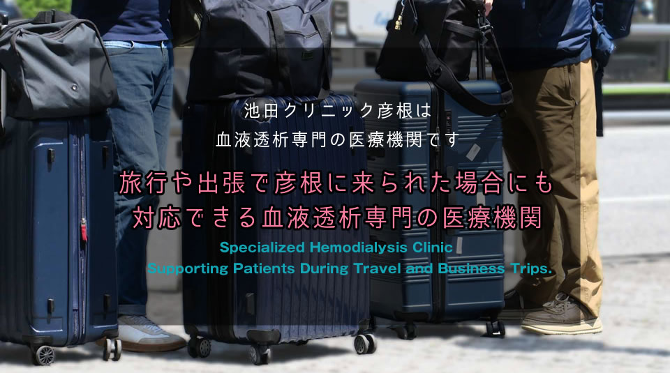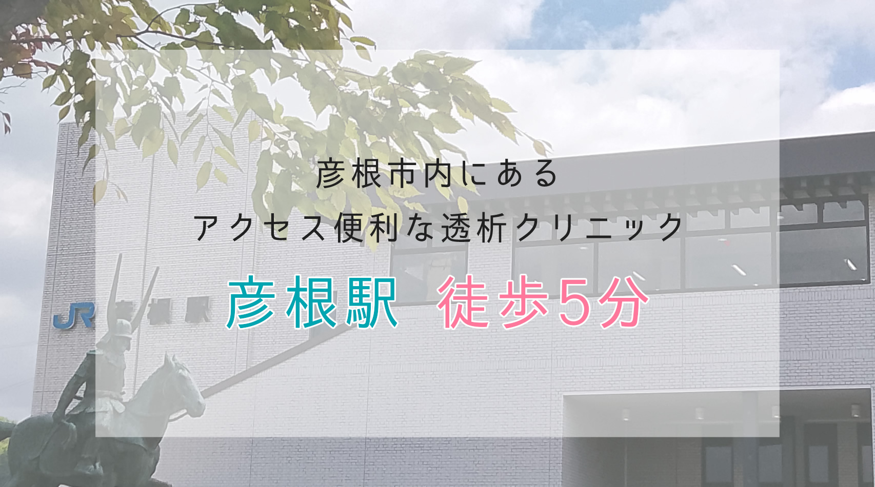 彦根駅より徒歩5分に位置するクリニックですので、彦根近郊にお住まいの方はもちろん、旅行やご出張で彦根に来られる方の旅行透析なども受け付けております。