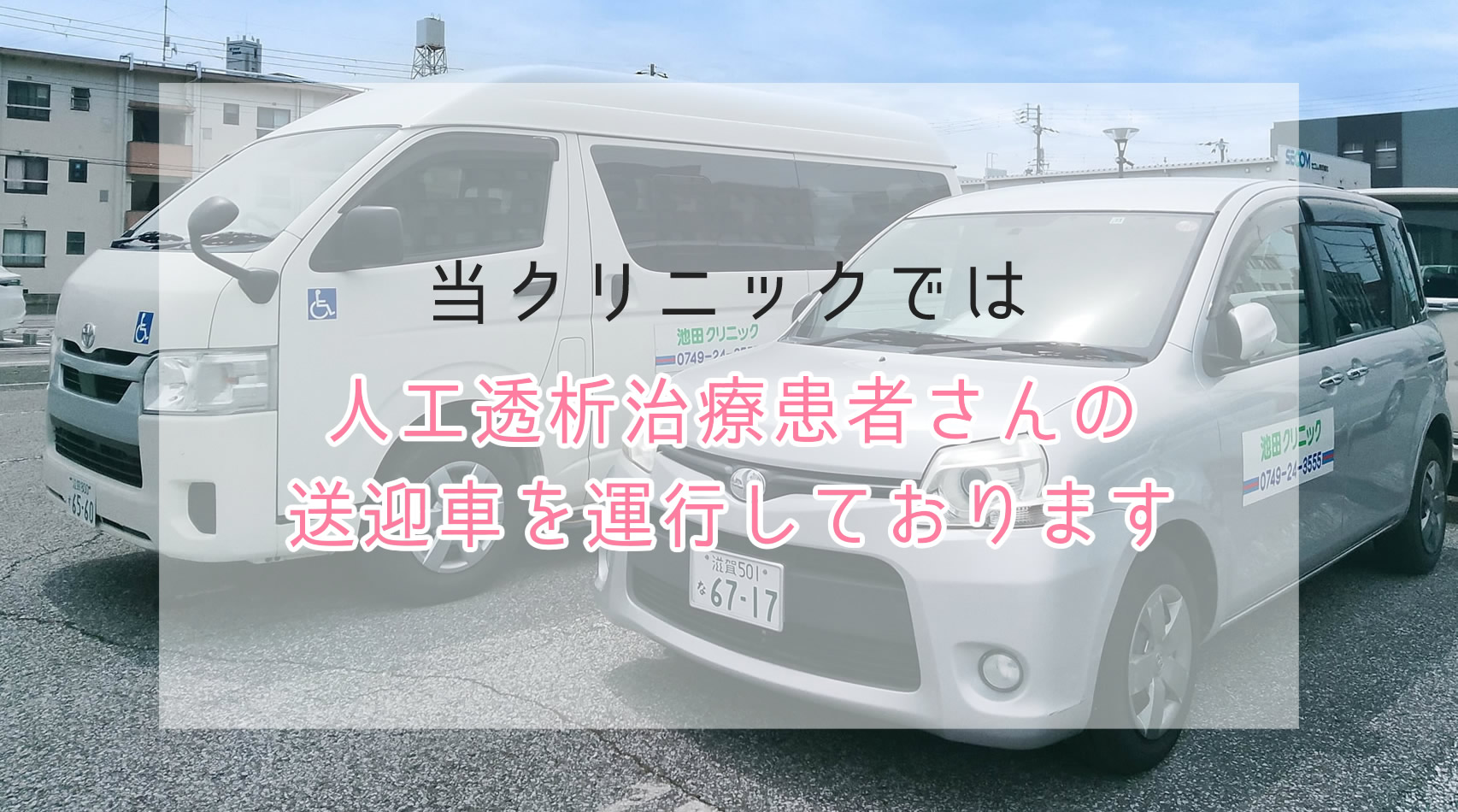 当クリニックでは人工透析治療患者さんの送迎車を運行しております。近隣の主要駅へのルート送迎。また、ご希望がある場合には、御自宅前の道路まで送迎も致します。